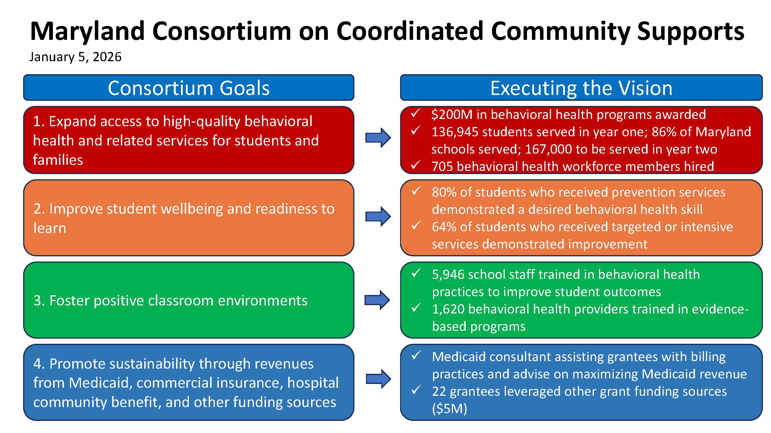 Consortium Impact Statement in Year 1: Consortium-funded programs served more than 136,000 students in 86% of Maryland's schools (2024-2025 school year). 80% of students demonstrated a new behavioral health skill and 87% and student and families report satisfation with the behavioral health services received.